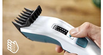 Pur si simplu selecteaza si blocheaza lungimea pe care o doresti. Pieptenele reglabil dispune de 12 setari de lungime blocabile, de la 1 la 23 mm, cu fix 2 mm intre fiecare lungime. Poti si sa scoti pieptenele pentru un tuns scurt de 0,5 mm. |